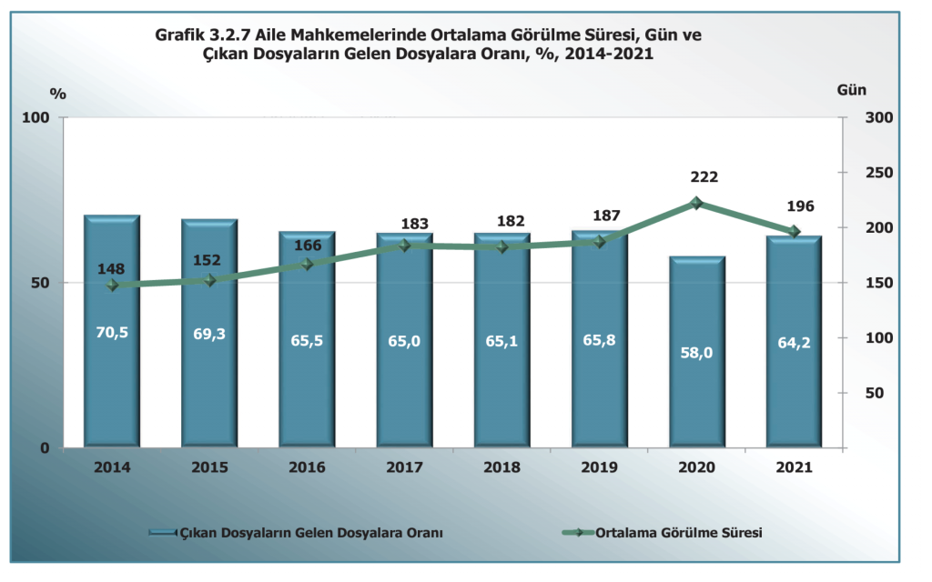 Yine 2021 yılına ilişkin istatistiklerde aile mahkemelerinde açılan bir boşanma davasının ortalama 196 gün sürdüğü görülmektedir. Burada anlaşmalı boşanma davalarının daha hızlı sürmekte olması sebebi ile ortalamanın aşağıya çekildiğini söylemek hatalı olmaz.
