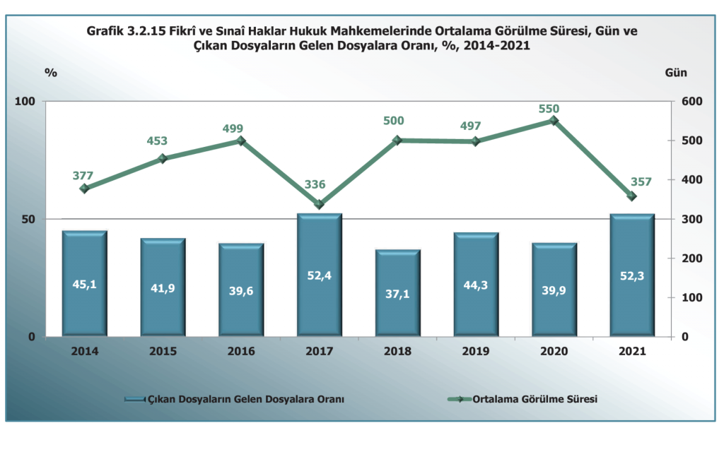 2021 adli sicil istatistiklerine göre, fikri ve sinai haklar hukuk mahkemesinde ortalama bir davanın karara çıkma süresi 357 gündür.