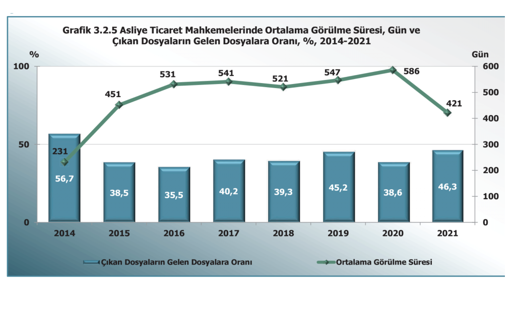 2021 adli sicil istatistiklerine göre, asliye ticaret mahkemesinde ortalama bir davanın karara çıkma süresi 421 gündür.