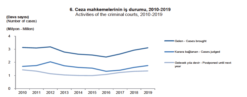 “Ceza mahkemelerinin son on yıllık çalışma trendine bakıldığında; gelen dava sayısında azalma olduğu görülmektedir. 2010 yılında ceza mahkemelerine gelen dava sayısı (geçen yıldan devir, yıl içinde açılan ve bozularak gelen toplam dava sayısı) 3 129 326 iken, %0,6′ lık azalma ile 2019 yılında 3 110 371 olmuştur.”